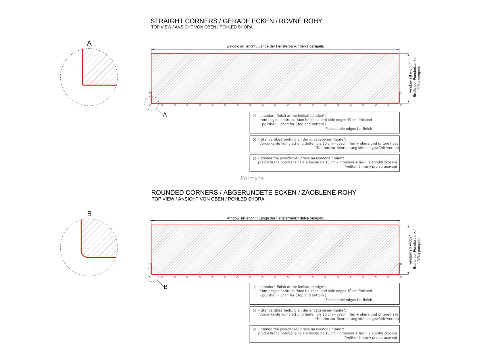 Výrobní norma: Rozměrová tolerance +/-5 mm, čelní strana leštěná se zkosením spodní a horní hrany, boční strany leštěné na 5–10 cm se zkosením spodní a horní hrany. Pokud mají být boční strany parapetů broušené po celé šířce, je nutné tuto skutečnost uvést v poznámkách.
